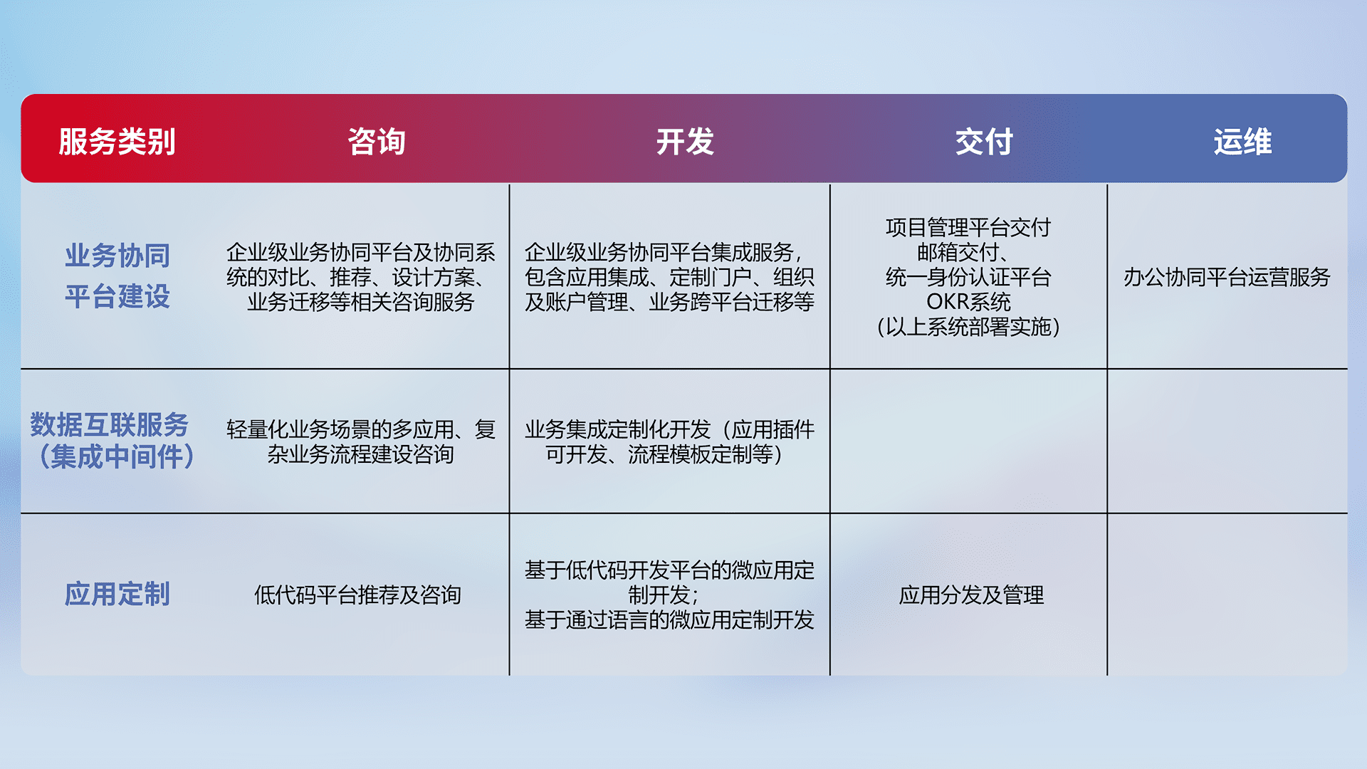 针对钉钉、、企微、、、、IDaas等平台级产品提供产品的规划、、方案、、、交付、、定制化开发等服务,,实现如统一协同办公、、、智能客户服务、、、混合会议管理、、智能数据查询、、等业务场景,,,实现数字化转型。。。。